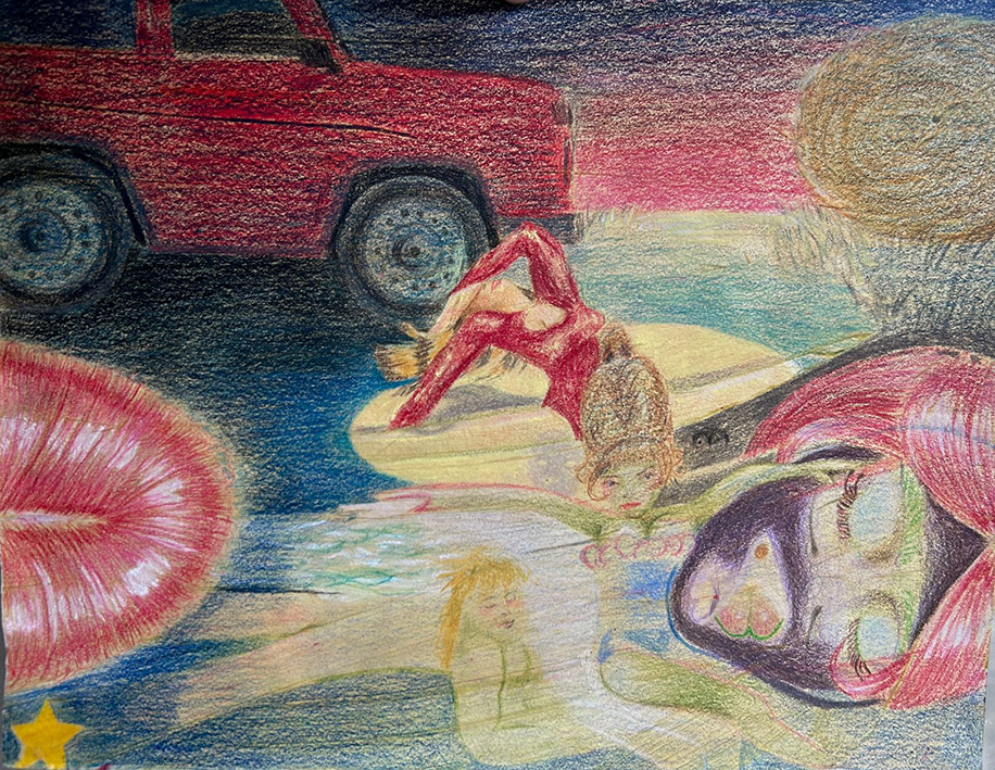 Sin dejar de lado la vulgaridad de un chándal heredado, los personajes de este mundo visten a menudo con corsets, pelucas kilométricas y escuchan a The B-52’s o Zara Larsson. Habitan una estética híbrida, donde lo doméstico y lo performativo conviven sin jerarquías. Se sienten cómodos en la oscuridad, siendo vistos bajo cierta luz. La noche no es solo un escenario, sino una condición: un tiempo suspendido donde los códigos se relajan y los cuerpos pueden ensayar otras formas de habitar. Bajo esa iluminación parcial, lo ambiguo se vuelve legible y lo íntimo adquiere una presencia casi física.